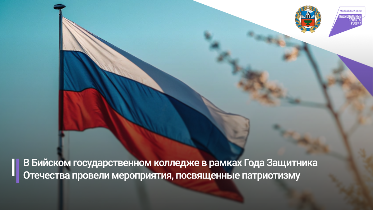 В 2025 году, объявленном Президентом России Владимиром Путиным Годом Защитника Отечества, Бийский государственный колледж начал серию мероприятий, направленных на патриотическое воспитание молодёжи. Торжественное открытие Года состоялось 25 января и включало конкурс «Студент года — 2025», приуроченный не только к этой тематике, но и к 80-летию Победы в Великой Отечественной войне — ключевому событию истории страны. Одним из важных событий стал краевой Форум профессиональных организаций «Пою моё Отечество», который объединил более 20 образовательных учреждений Алтайского края. Форум был посвящён вопросам эффективного патриотического воспитания, укреплению памяти о Великой Победе и формированию гордости за Родину. В мае колледж провёл конкурс патриотической песни «Битва хоров», где студенты продемонстрировали художественные способности и исполнительское мастерство, исполняя как классические, так и современные произведения с патриотической тематикой. «Год Защитника Отечества — это не толь