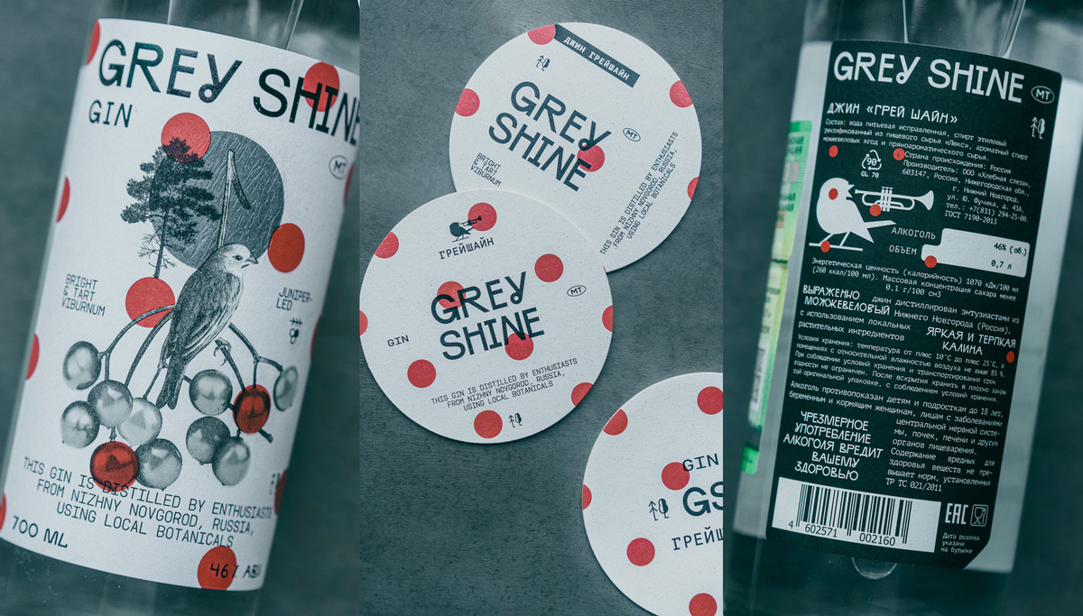 - Упаковка отражает «серая русская душа»: ручной шрифт, графика с калинами, сосной и таинственной птичкой (Павловский канарейка) .