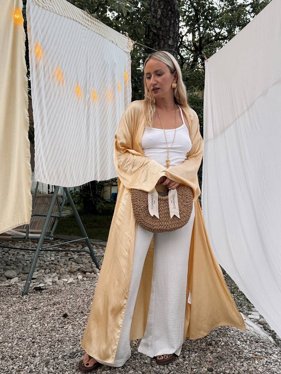 Вчера был очень душевный вечер в окружении красивых женщин, вкусной еды и невероятной атмосферы. Это все потому, что пара десятков женщин решили встретиться, хоть и не все были знакомы друг с другом. И это было так классно. У меня была куча причин не поехать, но я выбрала себя - отдохнуть, замедлиться, познакомиться. Как итог - новые классные люди и заряд энергии Все же, так важно делать новые непривычные действия, чтобы получить новый результат.. Для своего расслабленного образа выбрала такой наряд Халат Belle you Брюки Charmstore Майка 2mood Сумка Tendance Вьетнамки Belle you
