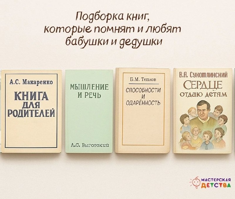 🛷 «А как воспитывали раньше?» Многие из нас выросли на советских книгах о воспитании. Сегодняшним родителям нередко кажется, что это было «слишком строго» или «одинаково для всех». Но если заглянуть глубже, можно найти и многое, что осталось актуальным. 😀 Подборка книг, которые помнят и любят бабушки и дедушки: 🤣А.С. Макаренко — «Книга для родителей» Классика, в которой дисциплина идёт рука об руку с уважением к личности ребёнка. 🥲Л.С. Выготский — «Мышление и речь» Не художественное чтение, но база для понимания, как развивается ребёнок. ☺️Б.М. Теплов — «Способности и одарённость» О том, как поддерживать детские таланты — без давления. 😊 В.А. Сухомлинский — «Сердце отдаю детям» Книга расскажет о важности воспитания любви к детям, чуткости, ответственности и духовном развитии. Эта книга служит источником вдохновения и размышлений для родителей и педагогов. 🌤 Возможно, какие-то книги до сих пор стоят на вашей полке? Расскажите о них в комментариях! #МастерскаяДетства
