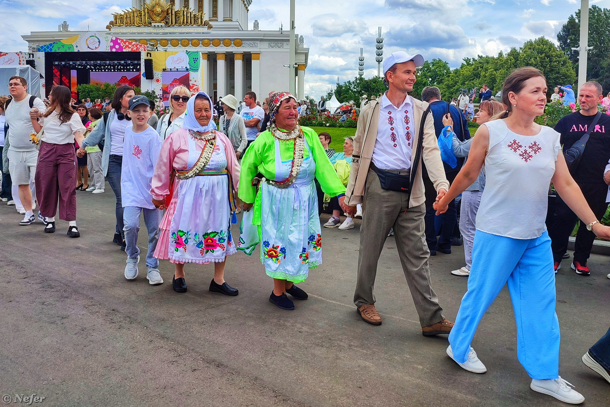 Готовится большой хоровод вокруг фонтана "Дружба народов". Он уже стал традицией московского Акатуя. Многие одеты в национальные костюмы или по крайней мере головной убор, в крайнем случае чувашская брошка или серьги. После шествия начался концерт, который продолжался до позднего вечера.