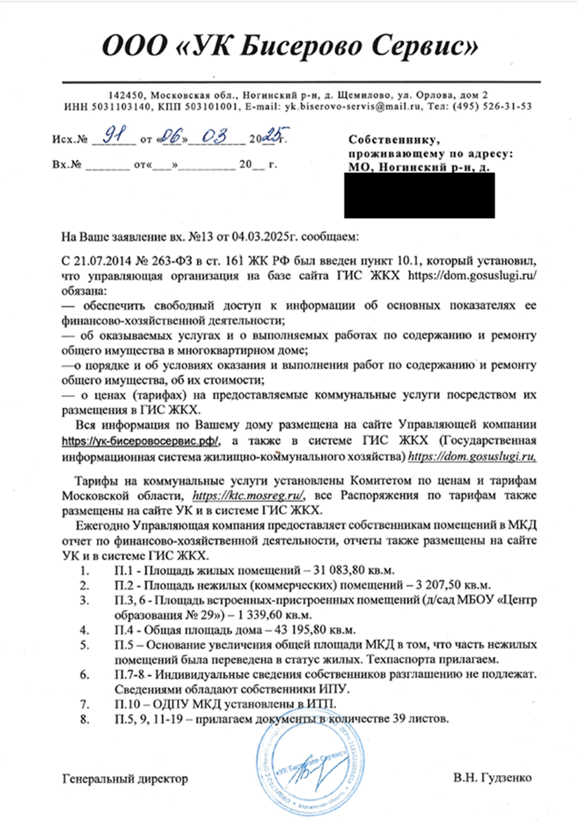 В Следственный комитет Российской Федерации г. Москва, ул. 1-я Фрунзенская, д. 3а. В Генеральную прокуратуру Российской Федерации ул. Большая Дмитровка, д. 15а, строен. 1, Москва, Россия, ГСП-3, 125993 В министерство внутренних дел Российской Федерации 119991, г. Москва, ул. Житная, 16 В Государственную думу Российской Федерации, Комитет по безопасности и противодействию коррупции Комитет по строительству и ЖКХ 103265, Москва, ул. Охотный ряд, д. 1 Наш дом, находящийся по адресу: Московская область, Богородский г.о., <адрес>, был построен в два этапа, в 2016 и 2017 годах. После этого дом не достраивался, не пристраивался, не надстраивался, никаких зримых изменений не происходило. До января 2021 года общая площадь дома согласно данным Росреестра и данным, указанным в ЕПД (Едином платежном документе, со сведениями о начислениях коммунальных платежей), составляла 37962,1 кв.м. Однако, с февраля 2021 года наш дом «вырос» на 4445 кв.м. до 42407,1 кв.м. (по данным в ЕПД). На наш запрос в упр