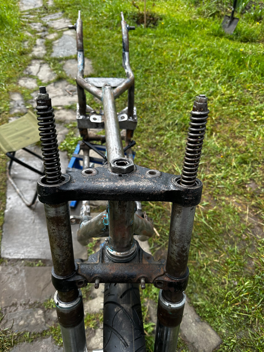 Ну и на этом я принялся красить кожухи вилки, а также стаканы амортизаторов. Поэтому элементы передней подвески и морды - отправились сушиться и отдыхать, а мотоцикл подождёт моего отпуска пока что без переднего колеса, снова на коленях.