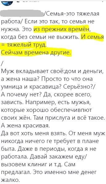 Разбираю комментарии, которые накопились за последнее время, и так много важных тем поднимают читатели! Случилось у нас бурное обсуждение вклада в семью со стороны женщины. И в одном комменте прозвучало мнение, что "Семья - это тяжелая работа". Такая формулировка вызвала недовольство со стороны части читательниц и развернулись подробные обсуждения на тему "работа ли семья?", требует ли семья каких-то трудозатрат? Или можно так организовать жизнь, что всё будет легко и просто, без усилий? - и это мнение будет №1. Другая часть читательниц говорит о своем труде, что он есть - это будет мнение №2. Комментов много! Я не буду их копировать сюда все. Только ключевые размещу, которые мне показались наиболее яркими в отражении ситуации. (ведущее мнение - можно так организовать жизнь, что всё будет легко и просто, без усилий; "семья - это труд" - ощущение из прежних времен, сейчас неактуально): (ведущее мнение, что семья - это работа, усилия нужны, без них не получается) (советы, как сделать та