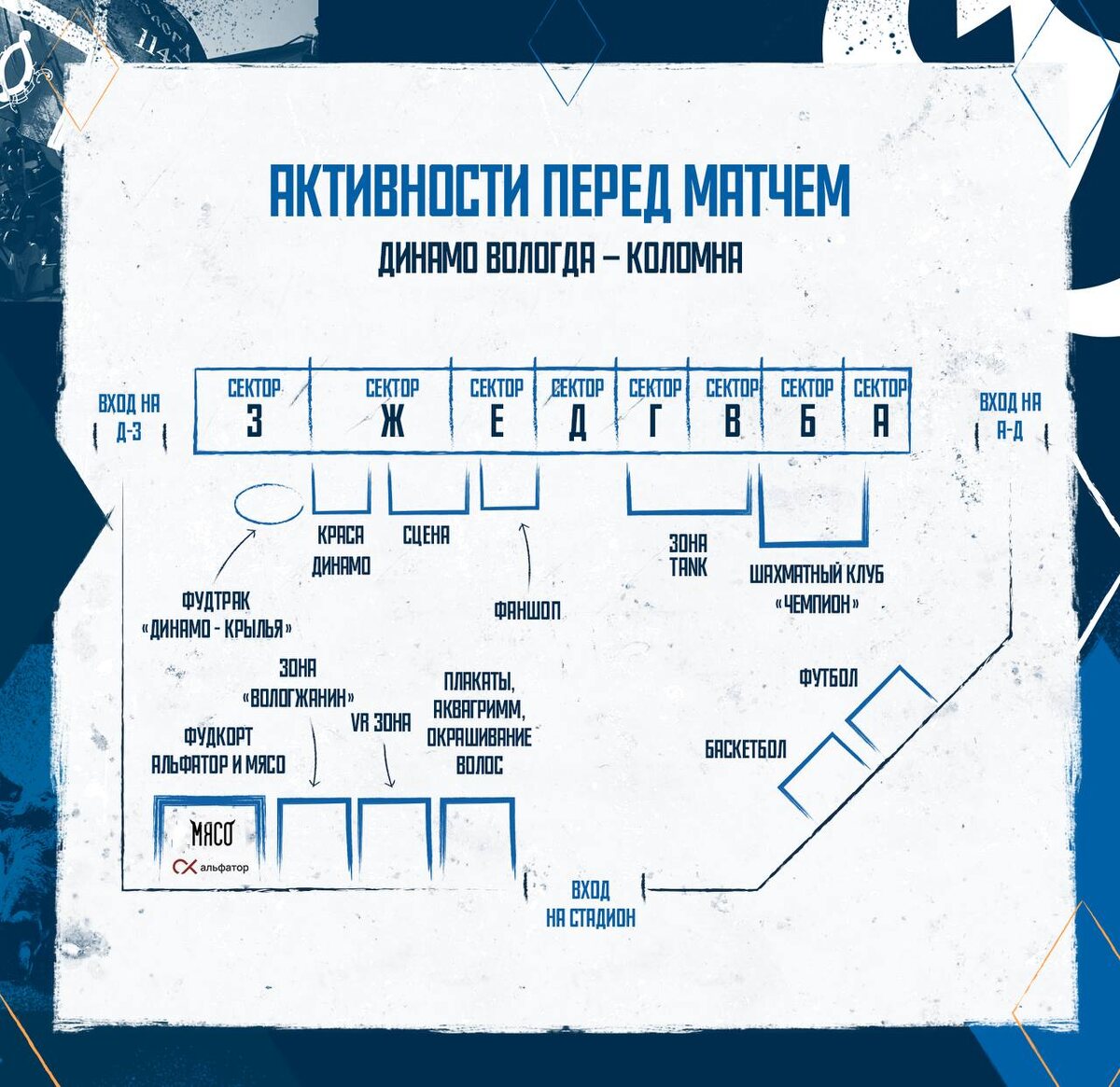 Празднуем день города вместе с «Динамо» 🙌 Изучай схему матчдей-программы перед игрой с «Коломной» и планируй свой поход на родной стадион заранее 💙 Билеты еще есть: clck.ru/3MdWQX 🎟 @dynamovologda