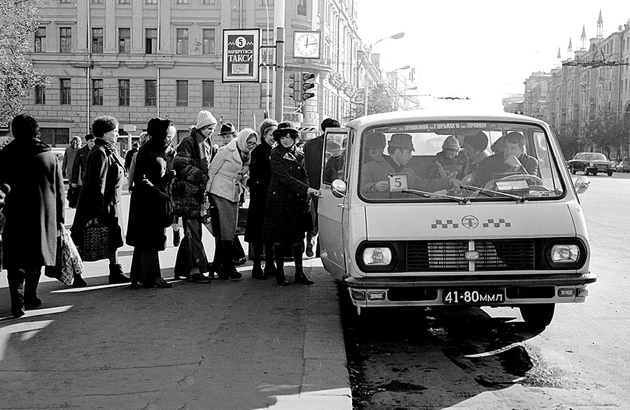 Официальные маршрутные такси появились в нашей столице в 1974 году. Микроавтобусы округлых форм РАФ-977ДМ отправлялись от Белгосфилармонии по шести направлениям: в Чижовку, Серебрянку, Курасовщину, до улиц Жудро, Ландера, Казинца. Для жителей этих кварталов они стали спасением. Например, улица Жудро в ту пору была окраиной города. Автобусы туда ходили редко, с большими интервалами. Считалось, что для запуска интенсивного движения коммунального транспорта в районе маловато населения. И вдруг жителям предложили комфортабельные микроавтобусы. Правда, по утрам, чтобы в них попасть, приходилось отстоять очередь. К тому же очень скоро водители перестали соблюдать правила, и набивался полный салон. Многие ехали стоя, нависая над успевшими сесть. Поручни в машине отсутствовали, да и потолок был низким. Стоимость поездки — 15 копеек (цена сливочного мороженого). В автобусе и позже в метро — 5 копеек, в троллейбусе — 4, в трамвае — 3 копейки.