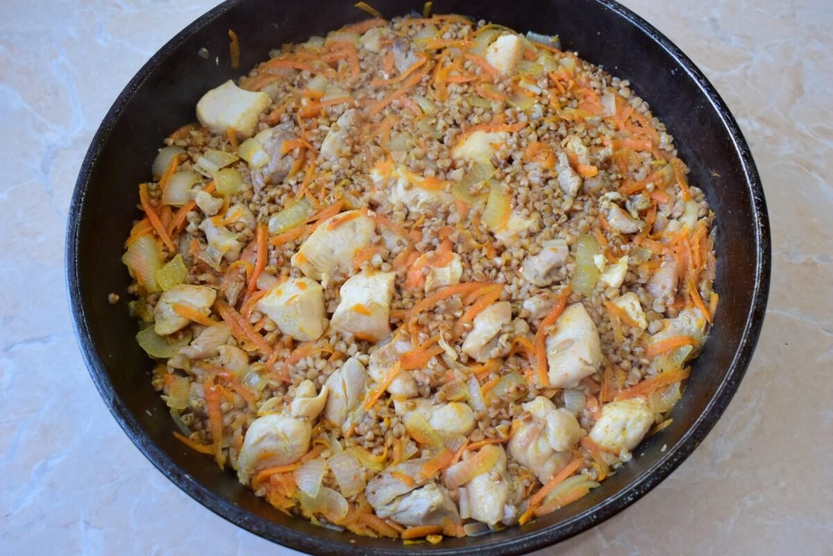 Гречка с курицей и овощами на сковороде — простой и вкусный обед на каждый день