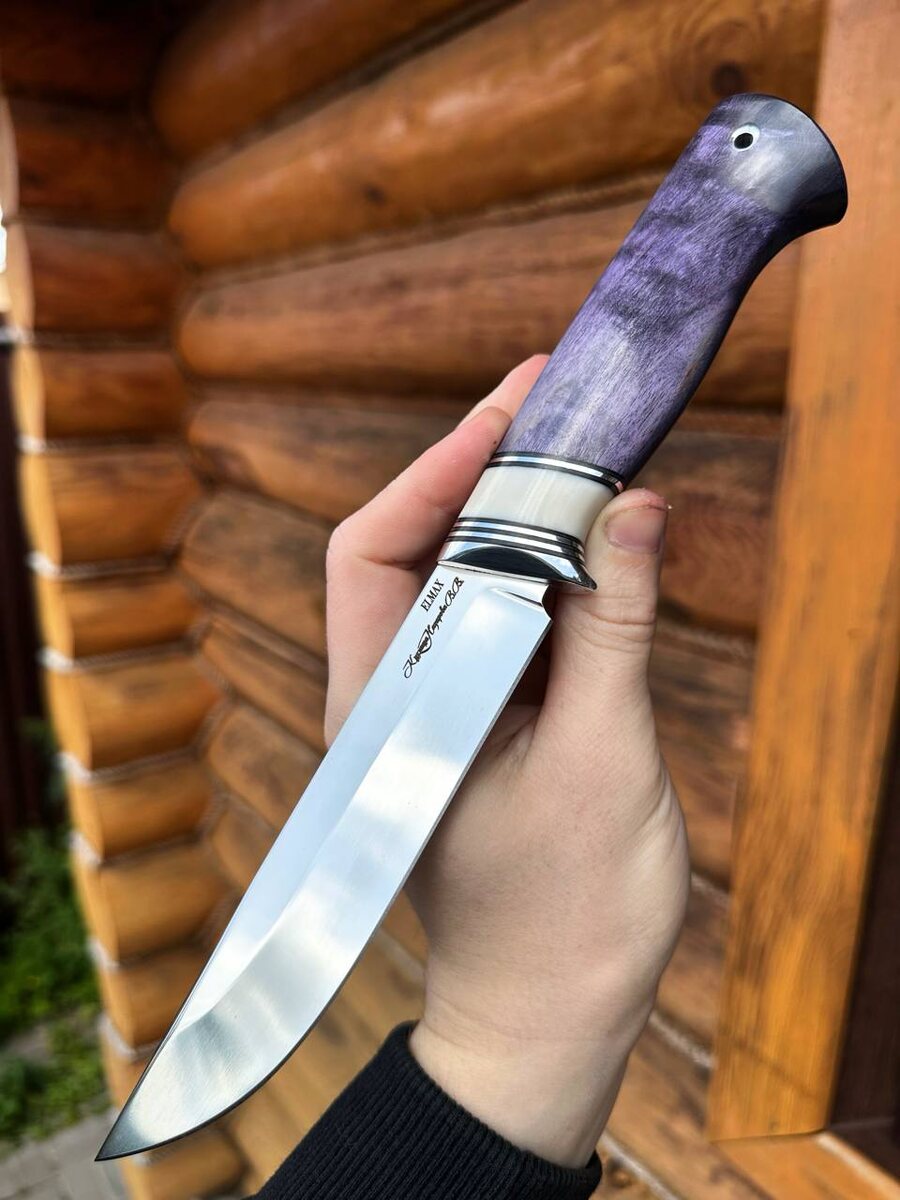 Рукоять на ноже выполнена из стабилизированной карельской березы фиолетовой и акрила белого.