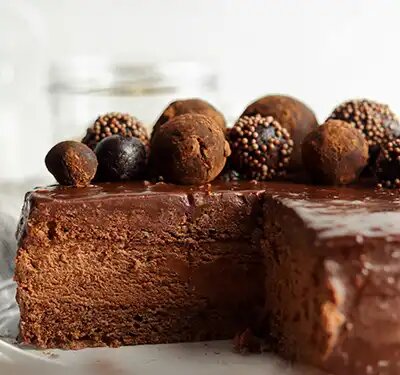 12. Покройте весь торт, верх и бока глазурью. Сверху выложите трюфели. Охладите в холодильнике еще час. Всем желаю приятного аппетита!