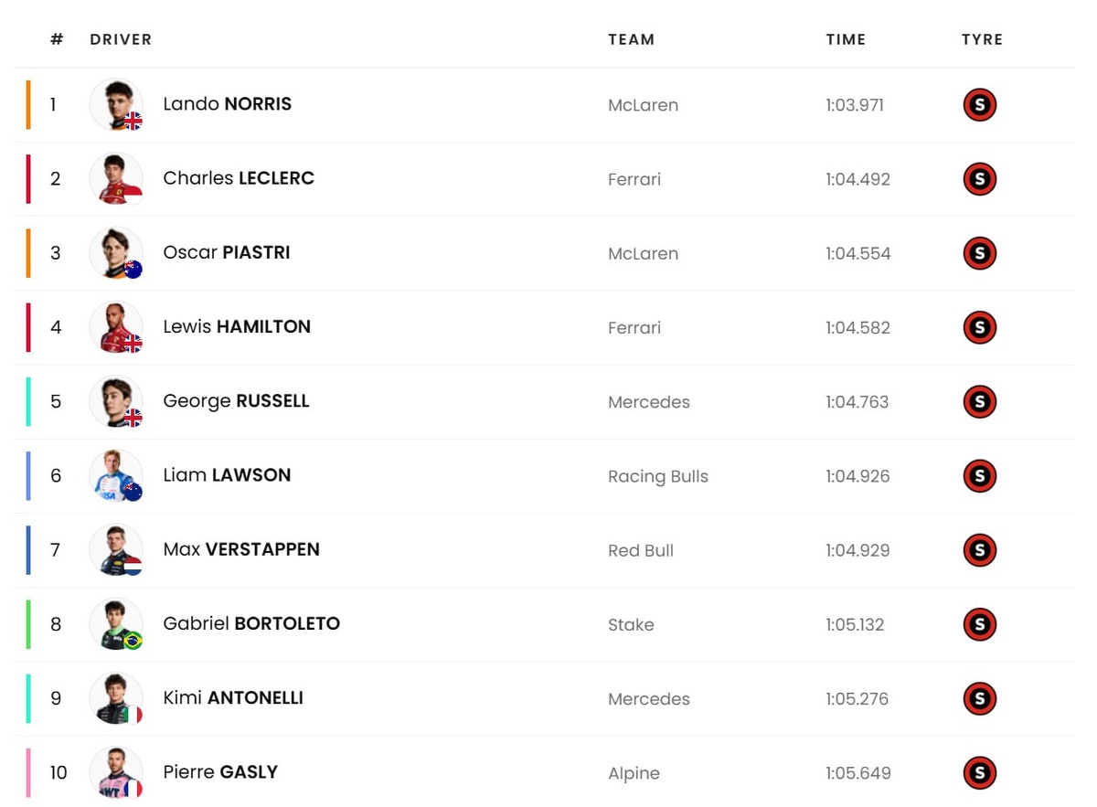 Результаты квалификации гран-при Австрии: Норрис на своей лучше трассе забирает поул и только в половине секунды от него Леклер. И это на коротком круге Австрии! Ред Буллы обычно к субботе прибавляют, но сегодня темп наоборот пропал, а машина стала неуправляемой. Причем лучшим из их четырех гонщиков оказался Лоусон, наконец первый хороший результат от него за сезон. Хотя стоит учитывать, что Макс бросил финальную попытку из-за желтых флагов Гасли, что в итоге затронуло и Пиастри, лишив нас какой либо борьбы за поул. У Мерседесов так темп и не появился, а вот Бортолето удивлял всю квалу, так ещё и на финальном круге Макс решил раздать ему слипстрим после своей неудачной попытки, что позволило Габриэлю занять 8 место. Гасли замкнул десятку, а Алонсо остановился в шаге от Q3.