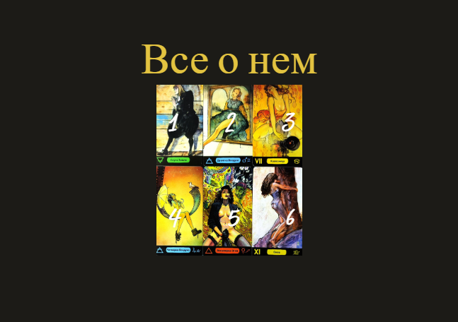 Расклад покажет краткий срез о нем и ваших с ним отношениях на текущий момент времени. Что он чувствует, что думает о вас, его намерения и что в ближайшее время предпримет в вашу сторону. Дальнейшее развитие отношений в загаданный вами срок. Как вам лучше себя вести с ним сейчас.