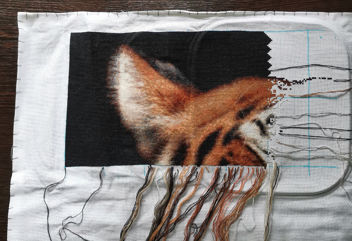 Тигрули за 2 дня продвинулись на 600 крестиков. Всего вышито на работе 15374 крестика, что составляет 10,1%. Оставшаяся часть фрагмент ввшивалась уже легче, чем это было в начале. Развернула работу, переставила пяльца. В итоге получается неплохо🤔🤗 Я подобралась с уже к глазику😋 он начинается в правом нижнем углу.