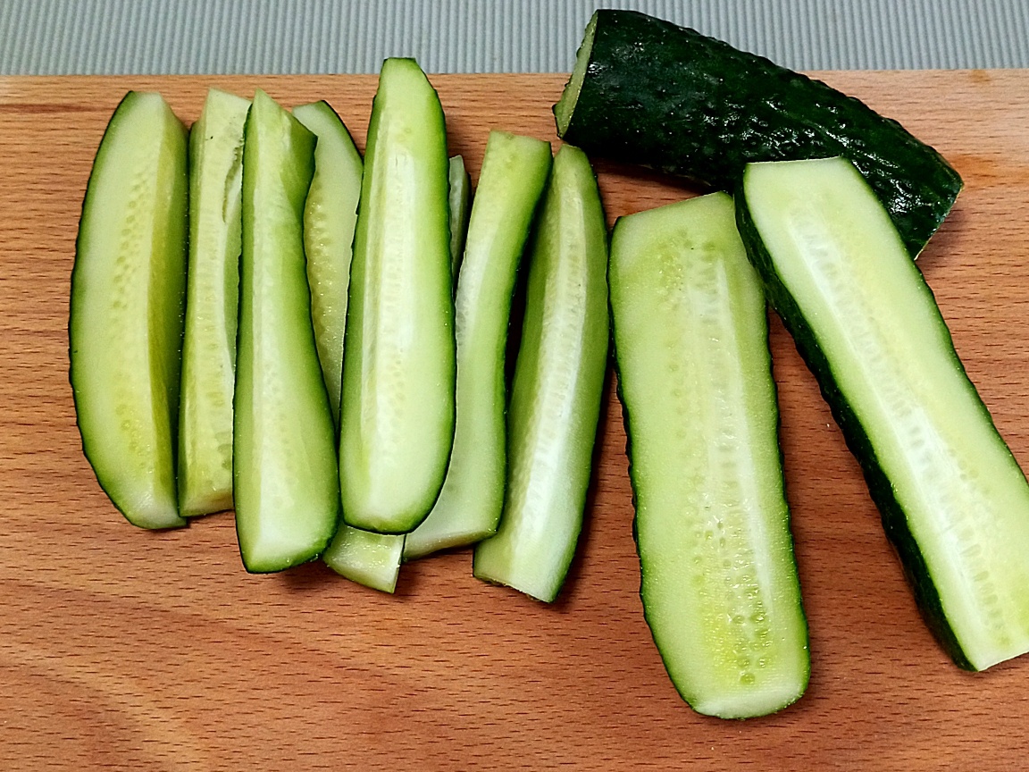 1. Промыаем огурцы ,срезаем хвостики с двух сторон.Огурцы нарезаем на четыре части вдоль.