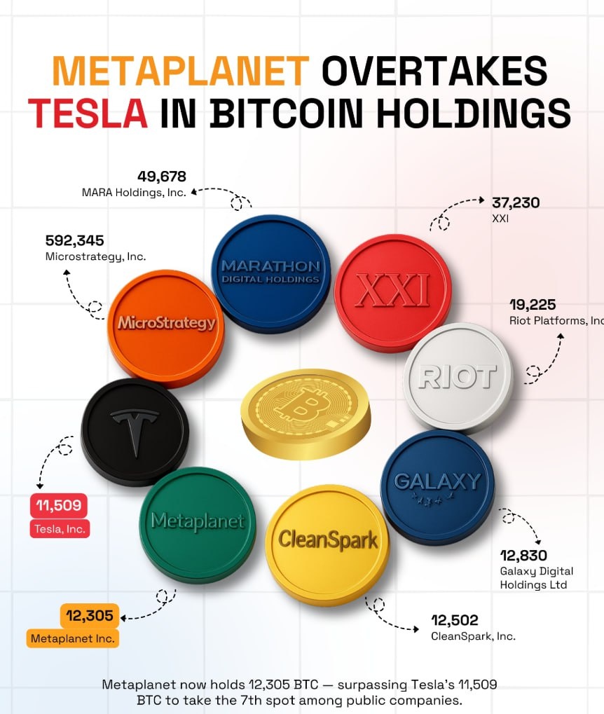 πΊ Metaplanet ΠΎΠ±ΠΎΡΠ»Π° Tesla ΠΏΠΎ ΠΊΠΎΠ»ΠΈΡΠ΅ΡΡΠ²Ρ Bitcoin Π½Π° Π±Π°Π»Π°Π½ΡΠ΅, Π·Π°Π½ΡΠ² 7-Π΅ ΠΌΠ΅ΡΡΠΎ ΡΡΠ΅Π΄ΠΈ ΠΏΡΠ±Π»ΠΈΡΠ½ΡΡ ΠΊΠΎΠΌΠΏΠ°Π½ΠΈΠΉ Ρ 12 305 BTC