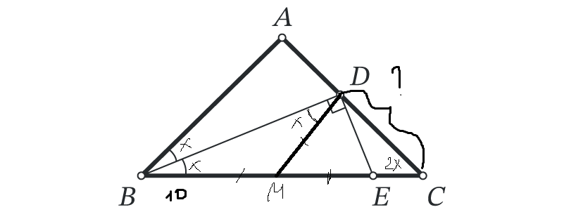 В равнобедренном треугольнике ABC с основанием BC проведена биссектриса BD. Прямая, проходящая через D перпендикулярно BD, пересекает отрезок BC в точке E. Найдите длину отрезка CD, если BE=10. Пусть углы при основании в треугольнике АВС равны по 2х. Построим в треугольнике BDE медиану к гипотенузе. Получим 2 равнобедренных треугольника. В треугольнике BMD углы при основании будут по х, а в треугольнике MDE по 90-х. Значит угол М в треугольнике MDE 180-2*(90-х) = 2х Получается, что треугольник MDC равнобедренный. MD=DC=5 (половина гипотенузы) Ответ 5 На стороне AC треугольника ABC нашлась такая точка D, что ∠ABD=90∘ и AD=2BC. Найдите угол ABC, если ∠BAC=24∘. Проведем в ABD медиану АМ, она будет равна половине AD, что равно ВС. В ABD угол D=90-24=66. Значит смежный ему 180-66=114. Треугольник BMD равнобедренный, углы при основании по 66, поэтому угол М=180-2*66=48 Треугольник BMC вышел равнобедренным, поэтому угол М= углу С. В треугольнике BDC угол D=114, угол С=48, значит В=18 Значит