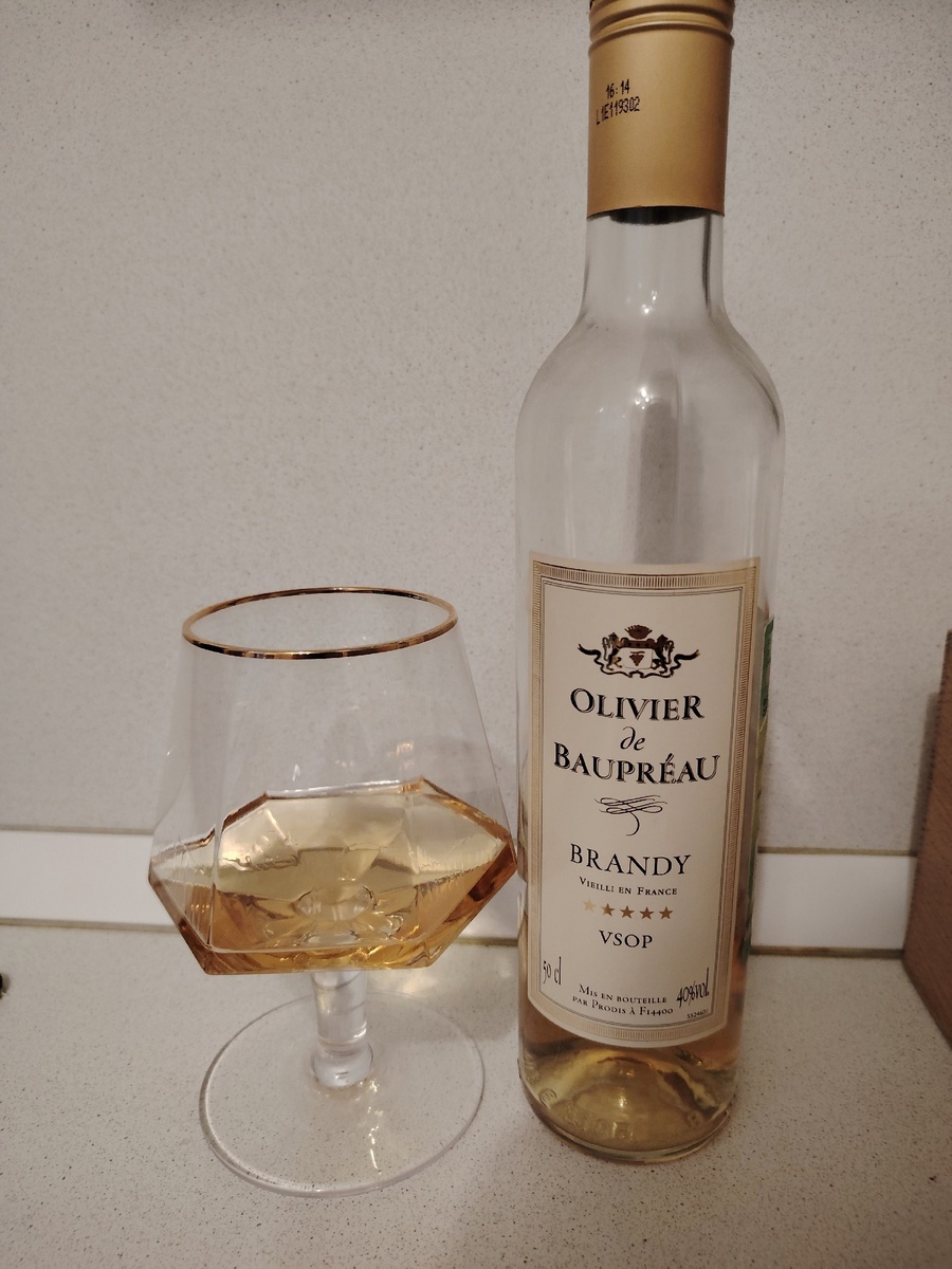 - Чрезмерное употребление алкоголя вредит вашему здоровью. Алкоголь противопоказан детям и подросткам до 18 лет, беременным и кормящим женщинам, лицам с заболеваниями центральной нервной системы, почек, печени и органов пищеварения. Ave, квириты! Сегодня на обзоре бренди «Olivier de Baupreau VSOP». Производитель SAS Maison Johanes Boubee, Франция. Поставщик – сеть «Ароматный мир». На сайте производителя, разумеется, ничего нет. Ну понятно, гонят для туземцев. Зато есть куча вина, ликёра и так далее. Ну ладно, описание на сайте продавца. Бренди ярко-золотистого цвета. Аромат напитка полный, с цветочными и пряными оттенками. Бренди обладает округлым, мягким, выразительным вкусом, в котором раскрываются тона ванили и древесины. Послевкусие длительное, теплое. Состав: дистиллят винный, выдержанный не менее 4 лет, вода питьевая подготовленная, сахар белый, пищевая добавка – пищевой краситель Е150а. Сорт винограда – Уньи Блан. Бутылка высокая, похожа на карандаш по форме. Пробка откручивающа