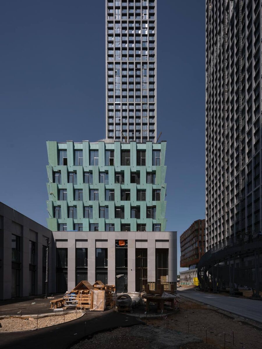 Жилой комплекс MOD от kleinewelt_architekten. Помимо трех коронованных особ-высоток уже стоят во всей красе более камерные 9-этажные клубные дома. Они же — гораздо более активные с точки зрения #архитектурапластичности: фактически каждое окно здесь трактовано как рельефная ячейка–эркер. Клубных домов тоже три, и для каждого выбран свой вид металла отделки: медь, латунь и панированная медь (напомним, что в MOD нет никаких имитаций: если уж камень — то натуральный, если латунь — то настоящая). Металлические поверхности по-разному отражают солнце и обыгрывают форму зданий. В первом доме — медном — эркеры похожи кубики, которые крутятся вокруг своей оси. «Золотой» латунный дом своим силуэтом напоминает волну. Наконец, фасад, одетый в зеленую патинированную медь, дробят сложные трапециевидные выступы. Все три дома расположены на едином стилобате, который уже тоже готов, а пространство вокруг частично благоустроено. Теперь ждем завершение внутренней отделки и открытие арт-парка, в которо