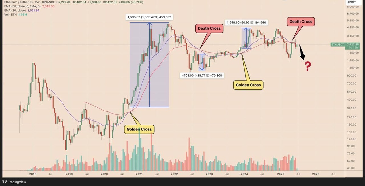 «Крест смерти» на 2-недельном таймфрейме – медведи из Twitter ожидают дамп #ETH до 1500-1800