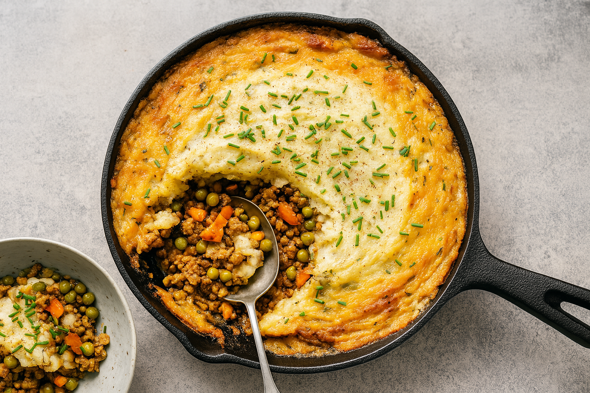 Shepherd’s Pie — это насыщенная мясная запеканка с овощами в густом соусе и пюре с сыром сверху. Уютная, сытная и очень домашняя еда, которая подходит и для буднего ужина, и для праздников вроде Дня Святого Патрика. В оригинале Shepherd’s Pie готовят из баранины, а если используется говядина — это уже Cottage Pie. Но пусть названия не пугают: оба варианта вкусны и готовятся одинаково. В большой сковороде разогрейте масло на среднем огне. Обжарьте лук до мягкости — около 5 минут. Добавьте фарш, специи (тимьян, петрушку, розмарин, соль и перец). Готовьте, пока фарш не станет коричневым (6–8 минут). Добавьте чеснок и вустерширский соус. Готовьте ещё 1 минуту. Вмешайте муку и томатную пасту до однородности. Влейте бульон, добавьте горошек, морковь и кукурузу. Доведите до кипения, затем тушите 5 минут до загустения. Отставьте в сторону. Включите духовку — 200°C. Варите картофель в подсоленной воде 10–15 минут, пока не станет мягким. Слейте воду, верните картофель в горячую кастрюлю, дайте п