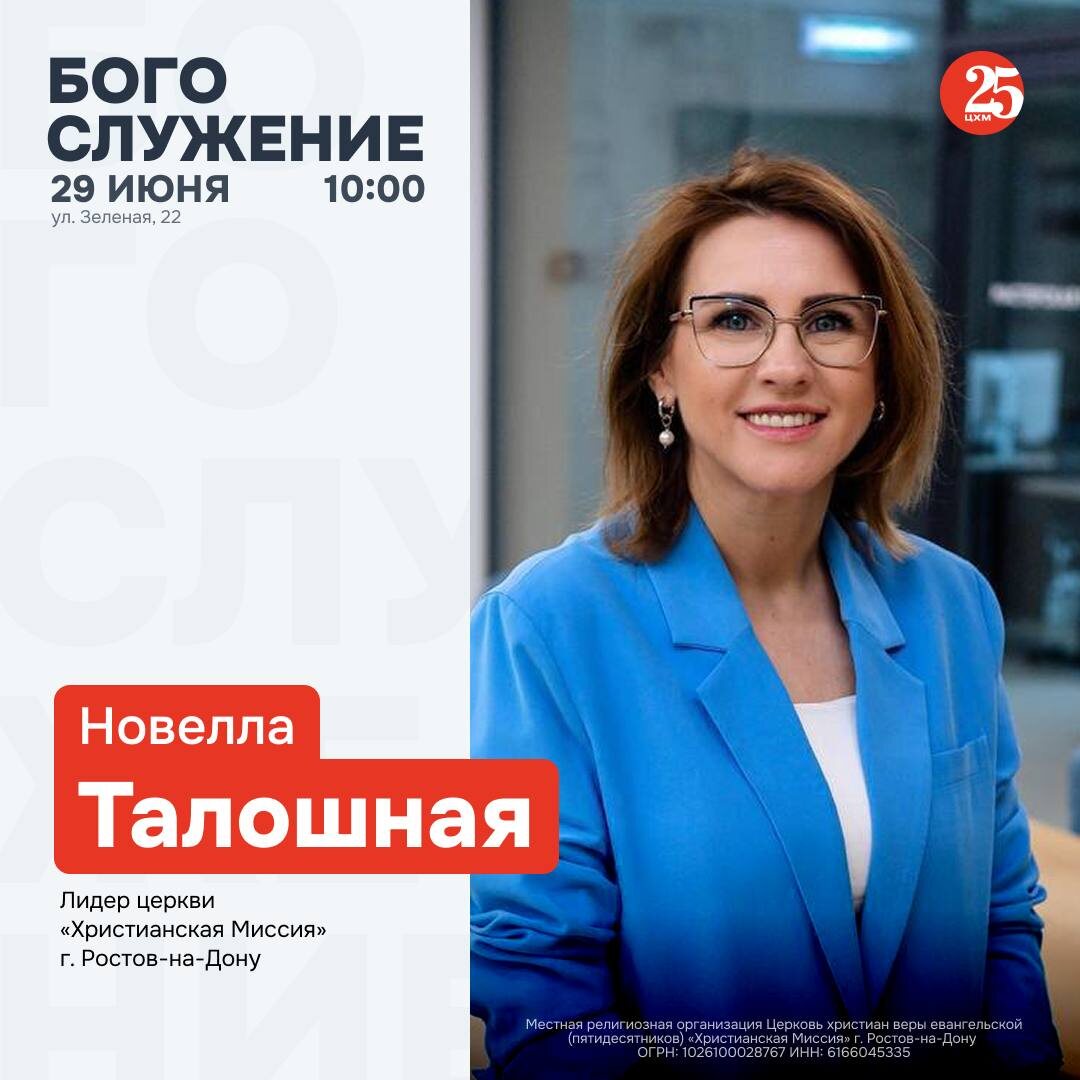 БОГОСЛУЖЕНИЕ 29 июня в 10:00 ⛪️ Приходите на встречу с Господом, провести время в молитве, единстве и общении. Богослужение проведет Новелла Талошная лидер церкви «Христианская Миссия» г. Ростов-на-Дону 🙌 Молодежное богослужение проведет Тимур Рыбянченко молодёжный пастор церкви «Христианская миссия» г. Ростова-на-Дону ✨ До служения проходит молитва. В 9:30 ждем вас. «Шесть дней ешь пресный хлеб, а на седьмой день проведи собрание Господу, твоему Богу, и не делай никакой работы.» Второзаконие 16:8 НРП Благословляем вас и приглашаем на богослужение! Адрес: Зеленая, 22 🖥 ВКонтакте «Цхм Ростов», трансляция служения — https://vk.com/cxm.rostov 🖥 РУТУБ «Цхм Ростов» трансляция служения — https://rutube.ru/channel/39499224/ 🖥️ YouTube «Цхм Ростов». Трансляция служения - https://youtube.com/@cxmrostov?si=gSKP3_oMbfVza0gg