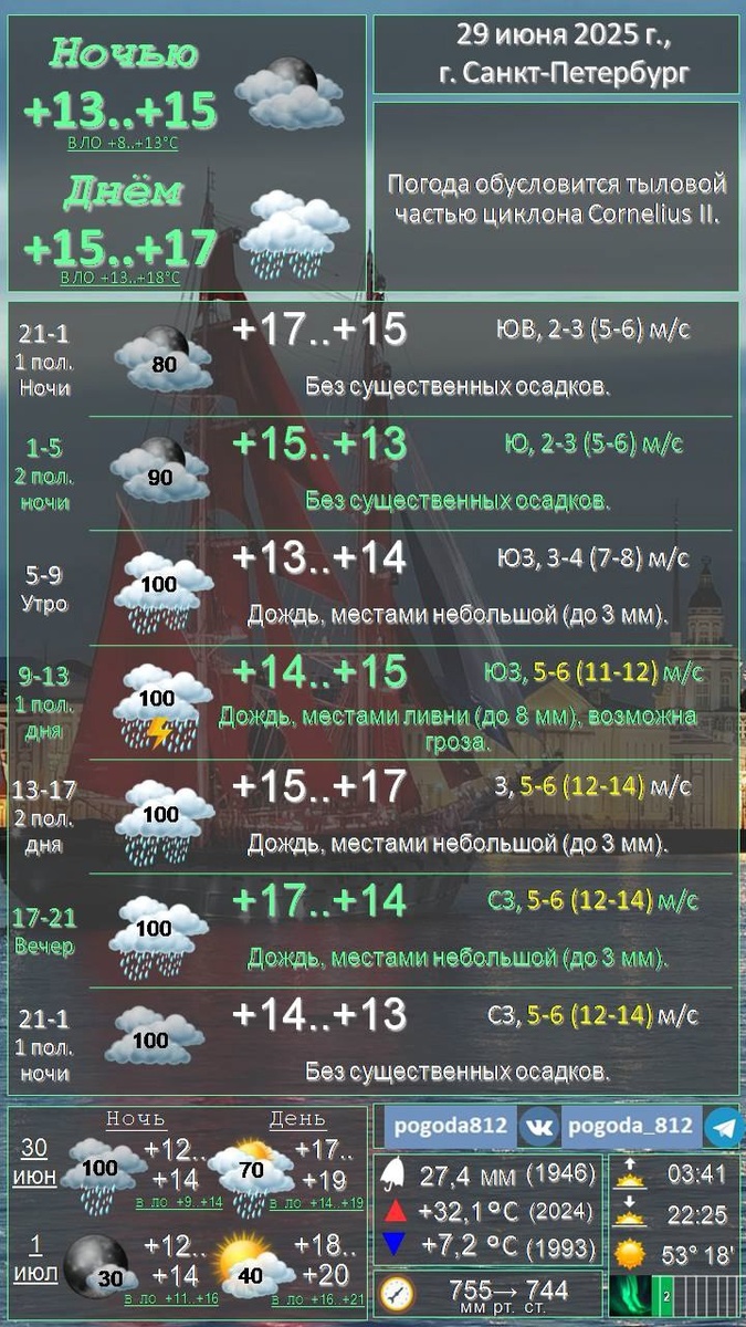 В понедельник, 30 июня, ночью тоже будет пасмурно, температура опустится до +12..+14°С, местами пройдут кратковременные дожди. Днём небо немного прояснится, и будет облачно с прояснениями, а температура достигнет +18°С.