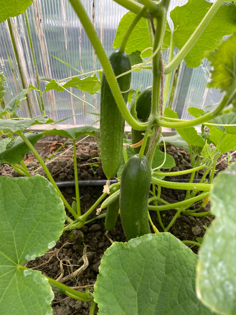 Подкрепилась и в теплицу. А там красота! Несмотря на жуткий холод и проливные дожди, огурчики-таки выросли.