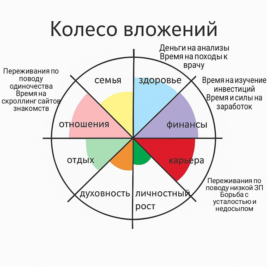 1. Колесо вложений. Здесь оценивается не удовлетворенность жизнью, а то количество ресурсов, которые вы вкладываете в эту сферу - времени, сил, денег, эмоций, внимания. Это позволяет выявить, какие сферы занимают больше вашего внимания, а какие вы "забросили". Чтобы упражнение было ещё эффективнее, после этого можно оценить удовлетворение по каждой сфере и посмотреть, действительно ли ваши затраты сил приводят к ощущению успеха и счастья. Может оказаться так, что то, куда вы вкладываете больше сил, совершенно не приносит вам ничего хорошего. Тогда можно посмотреть, какие именно силы и ресурсы вы тратите на этот аспект жизни и как можно их перераспределить. Например, если вы много сил тратите на сферы "здоровье", "финансы", "карьера" и "отношения", то может быть полезно посмотреть, что именно вы делаете. Может выясниться, что в некоторых сферах (здоровье и финансы) вы действительно совершаете эффективные действия, а в других (отношения и карьера) большинство сил уходит на навязчивые мысли, переживания и борьбу с ними (хотя до этого из-за повышенного контроля этой сферы казалось, что вы ПОСТОЯННО что-то делаете и много вкладываете).