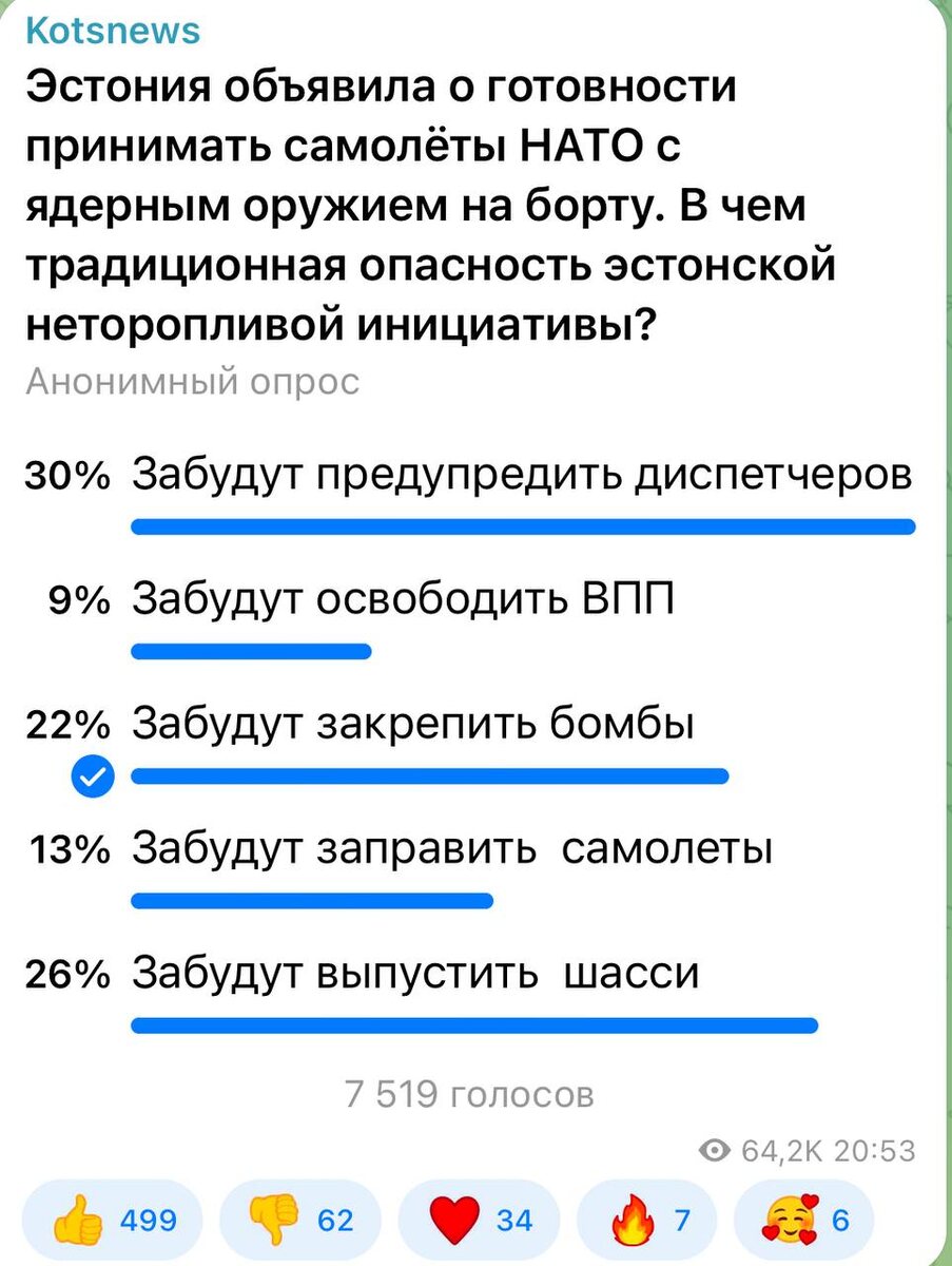 ⚡️⚡️⚡️ 30 процентов проголосовавших считают, что неторопливые эстонцы забудут предупредить авиадиспетчеров. Наверное, думают, что самолеты к ним год лететь будут.