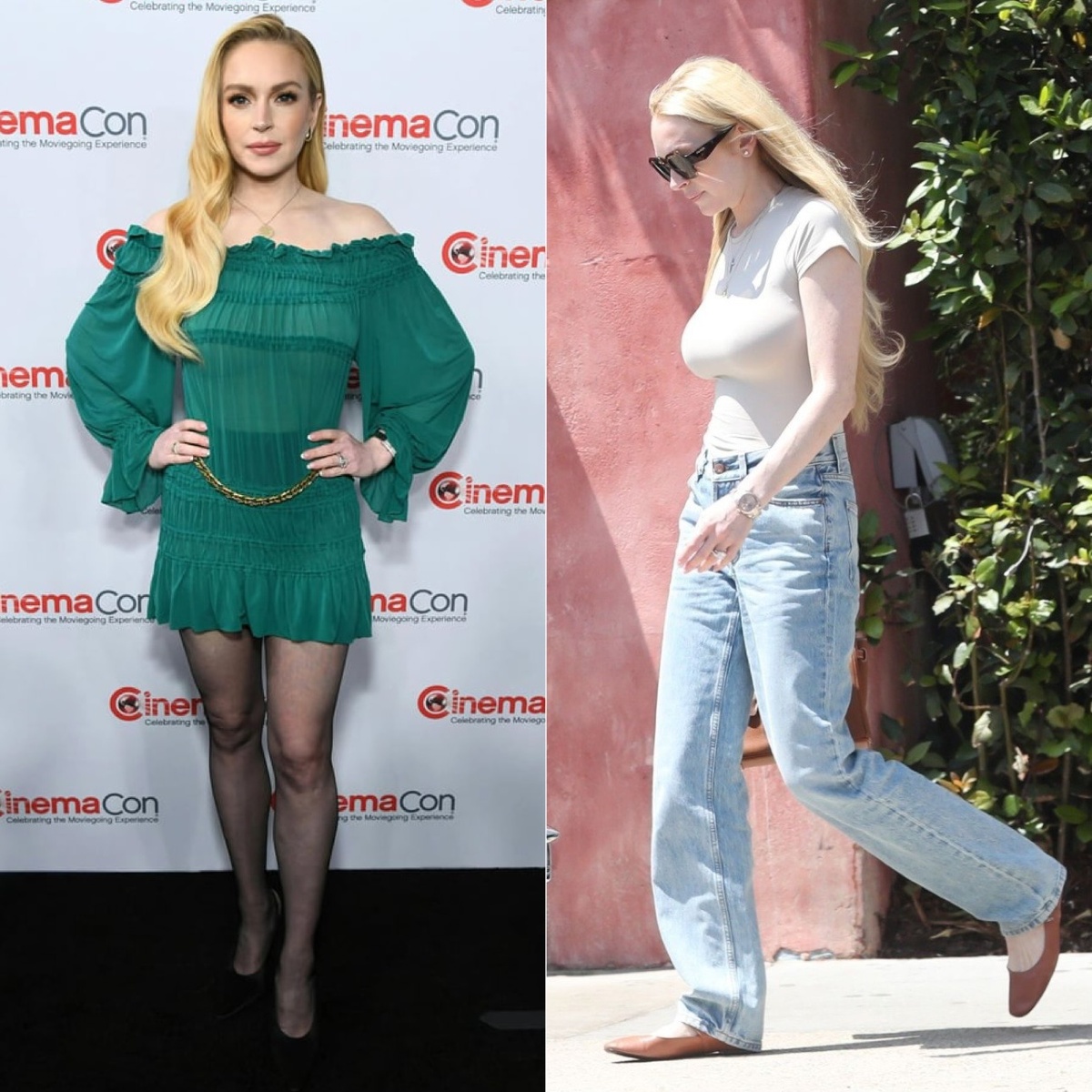 Линдси Лохан в последние годы преобразилась до неузнаваемости. Усердная работа над собой и профессиональная помощь косметологов сотворили чудо. Её появления на красных дорожках теперь блестящие, хотя последний выход на CinemaCon 2025 в изумрудном платье Saint Laurent, пожалуй, не стал апогеем стиля. Платье-крестьянка из невесомого шифона, сквозь которое дерзко проглядывало черное белье, и пояс-цепь жили словно в разных вселенных.