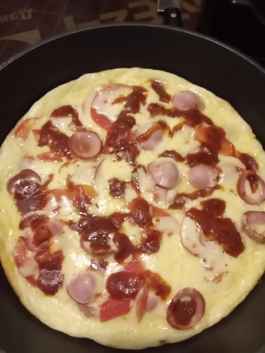 - Всем добрый субботний вечер❤️❤️❤️Сегодня я на скорую руку приготовила пиццу на сковороде.Легко и быстро делается ,особенно когда нагрянули гости.Рецепт:Тесто.4 столовых ложки сметаны ,4 ст.ложки майонеза,2 яйца, 6-7 ст. ложек муки, всё хорошо перемешать .Тесто должно быть по густоте как сметана.Выливаем его на смазанную сковороду.Затем делаем начинку,кто какую предпочитает ,или какие продукты есть в наличии😉Я делала самую обычную :сыр помидоры,сардельки,кетчуп.Затем готовим примерно 10 минут ,пока не расплавится сыр☝️на медленном огне,сковородку обязательно накрыть крышкой.Пицца готова.Всем приятного аппетита🙏🙏🙏🤝