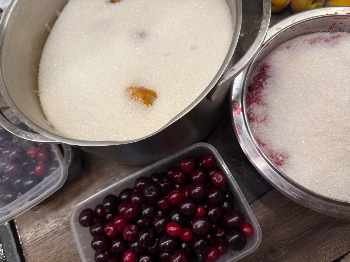 вишню поделила на три части: поесть, на варенье и на заморозку. Младший студент достал косточки, старший сбегал за сахаром. Абрикосы - поесть и тоже на варенье.