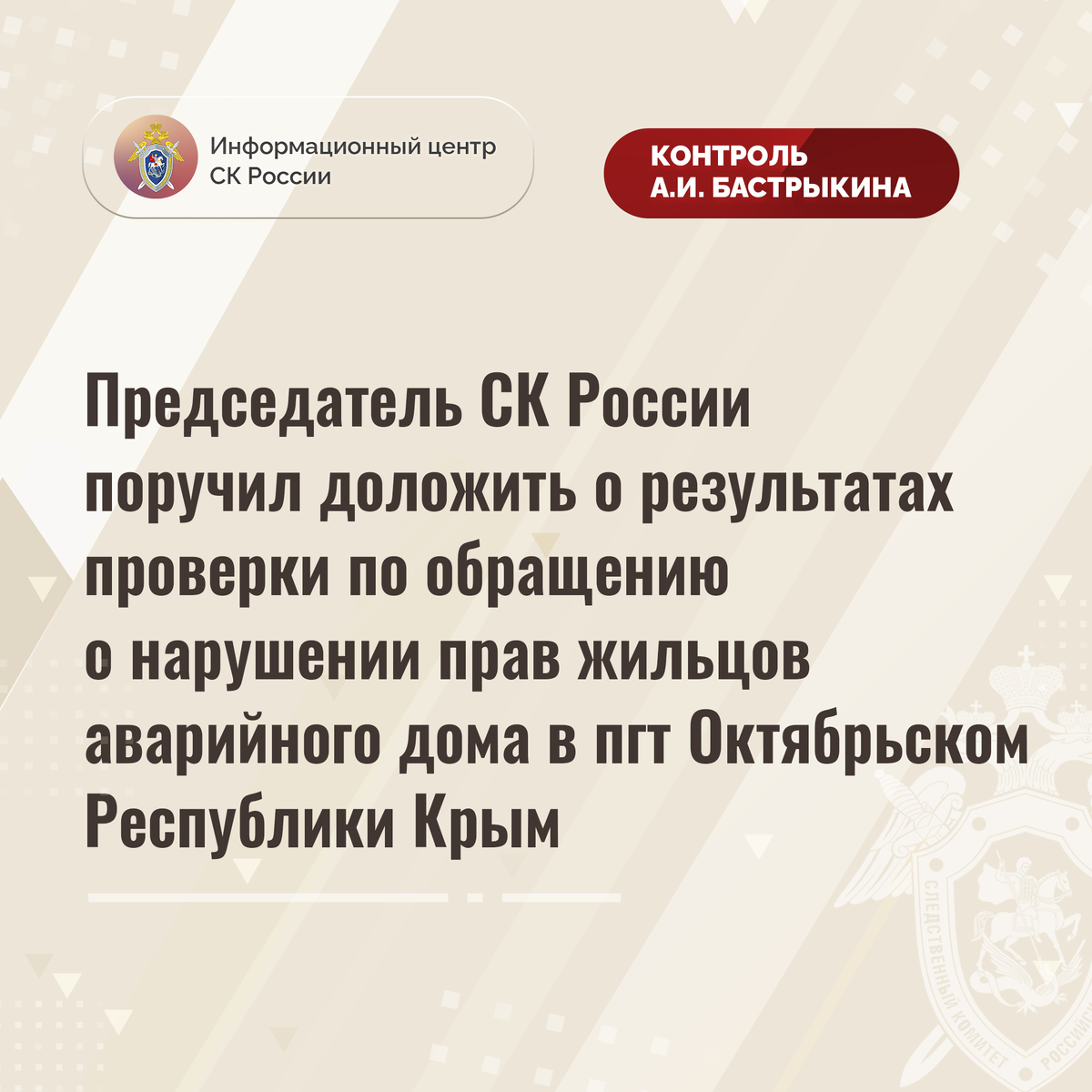 Председатель СК России поручил доложить о результатах проверки по обращению о нарушении прав жильцов аварийного дома в пгт Октябрьском Республики Крым В адрес Председателя СК России А.И. Бастрыкина через его приёмную «ВКонтакте» поступило обращение по вопросу нарушения прав жильцов многоквартирного дома по улице Тельмана в поселке городского типа Октябрьском Республики Крым. Ремонт здания, 1949 года постройки, длительное время не проводился. В связи с этим в настоящее время строение находится в непригодном состоянии, физический износ его конструкций превышает 90%. Пять лет назад дом признан аварийным, однако, несмотря на установление срока расселения до октября прошлого года, до настоящего времени благоустроенное жилье гражданам не предоставлено. Многочисленные обращения результатов не принесли. В ГСУ СК России по Республике Крым и городу Севастополю по данному факту проводится процессуальная проверка. Председатель Следственного комитета Российской Федерации Александр Иванович Бастрык