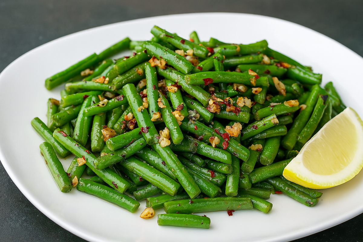 Быстрый, простой и универсальный гарнир на каждый день. Зелёная фасоль с чесноком и маслом — отличный способ добавить что-то тёплое и вкусное к любому приёму пищи. Она остаётся хрустящей, пропитывается ароматом чеснока и слегка острит за счёт чёрного перца. Подойдёт для всей семьи — от маленьких детей до пожилых. Фасоль промойте, обсушите и обрежьте кончики с обеих сторон. Нарежьте на кусочки длиной около 5 см — так она быстрее приготовится и будет удобна при подаче. Разогрейте сковороду или вок на сильном огне. Добавьте оливковое масло и выложите фасоль. Посолите и обжаривайте 2–3 минуты, постоянно помешивая. Влейте 1 столовую ложку воды или бульона, дайте жидкости выпариться, продолжая мешать. При необходимости повторите. Всего процесс занимает около 6 минут. Сделайте углубление в центре сковороды. Добавьте сливочное масло, мелко нарезанный чеснок и чёрный перец. Обжаривайте около 40 секунд до появления аромата, затем перемешайте с фасолью. Готовьте ещё 1–2 минуты, чтобы фасоль равн