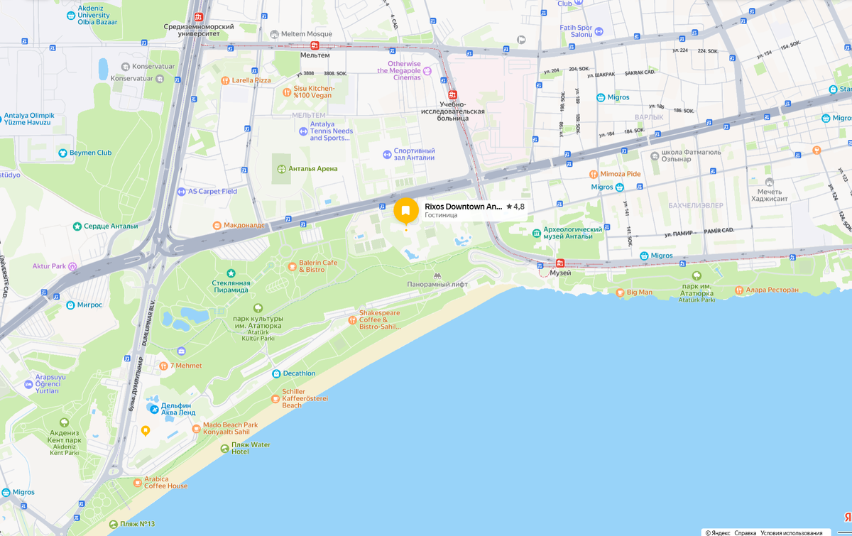 Отель находится в районе Муратпаша и выходит в парк культуры им. Ататюрка. В пешей доступности расположены Акдениз Кент парк, парк Кугулу, парк им. Ататюрка, колесо обозрения «Сердце Антальи», Археологический музей, Декатлон (небольшой магазин с изделиями для пляжного отдыха), различные кафе, аптеки, табачные магазины. Можно даже не брать отель с питанием «Все включено» и каждый день питаться в новом месте. Ехать до старого города на такси 10-15 минут в зависимости от пробок (скрин 3), на общественном транспорте - 30 минут (скрин 4).