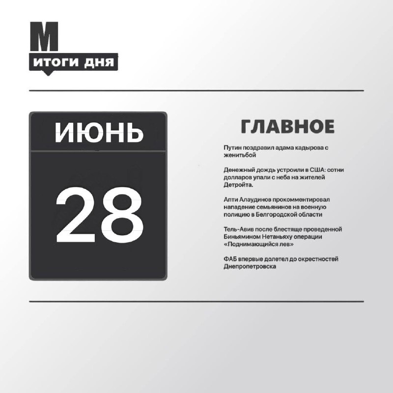 #итоги 28 июня 🌟Путин поздравил адама кадырова с женитьбой 🌟Денежный дождь устроили в США: сотни долларов упали с неба на жителей Детройта. 🌟Апти Алаудинов прокомментировал нападение семьянинов на военную полицию в Белгородской области 🌟Тель-Авив после блестяще проведенной Биньямином Нетаньяху операции «Поднимающийся лев» 🌟ФАБ впервые долетел до окрестностей Днепропетровска