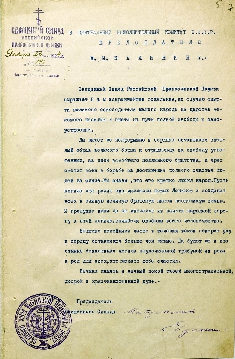 Священный Синод Российской Православной Церкви выражает Вам искреннейшее сожаление по случаю смерти великого освободителя нашего народа из царства векового насилия и гнета на пути полной свободы и самоустроения. Да живет же непрерывно в сердцах оставшихся светлый образ великого борца и страдальца за свободу угнетенных, за идеи всеобщего подлинного братства, и ярко светит всем в борьбе за достижение полного счастья людей на земле. Мы знаем, что его крепко любил народ. Пусть могила эта родит еще миллионы новых Ленинов и соединит всех в единую великую братскую и никем неодолимую семью. И грядущие веки да не изгладят из памяти народной дорогу к этой могиле, колыбели свободы всего человечества. Великие покойники часто в течение веков говорят уму и сердцу оставшихся больше, чем живые. Да будет же и эта отныне безмолвная могила неумолимой трибуной из рода в род для всех, кто желает себе счастия. Вечная память и вечный покой твоей многострадальной, доброй и христианской душе.