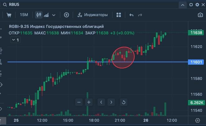 на 15-ти минутах видно, как дошли до уровня, проторговали его, потом пошли вверх и снова вниз. 🔼Оттолкнулись, теперь уже от линии поддержки (бывшего сопротивления) и вверх. Такая же формация может случиться и на дневном графике. Это классическое прохождение сопротивления.