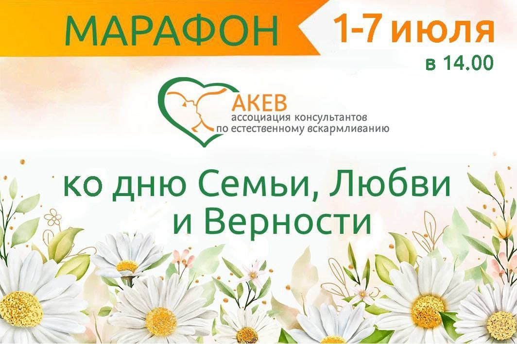 Предлагаем вас ознакомиться с расписанием выступлений Марафона ко дню Семьи. Начало всех выступлений в 14.00. 1 июля - Переход от грудного материнского молока к семейному столу – Лариса Чудинова - эксперт по материнству, детский нутрициолог, консультант по гв АКЕВ 2 июля - Как сэкономить семейный бюджет – Татьяна Юсова - консультант по гв и уходу за ребенком, наставник АКЕВ. 3 июля - Брать ли мужа на роды – Виктория Забалуева – консультант по гв АКЕВ, перинатальный психолог 4 июля - Кормящая мама и поддержка семьи – Лидия Распопова - Консультант по грудному вскармливанию и сну, консультант АКЕВ, перинатальный психолог 5 июля - Лайфхаки многодетной мамы – Марина Мулина -консультант АКЕВ, многодетная мама. 6 июля - Как подготовить старшего ребенка к рождению следующего - Юлия Таштабанова - консультант по гв АКЕВ, доула 7 июля - Супружеские отношения после рождения ребенка – Олеся Терещук - семейный и перинатальный психолог, консультант по ГВ, наставник АКЕВ