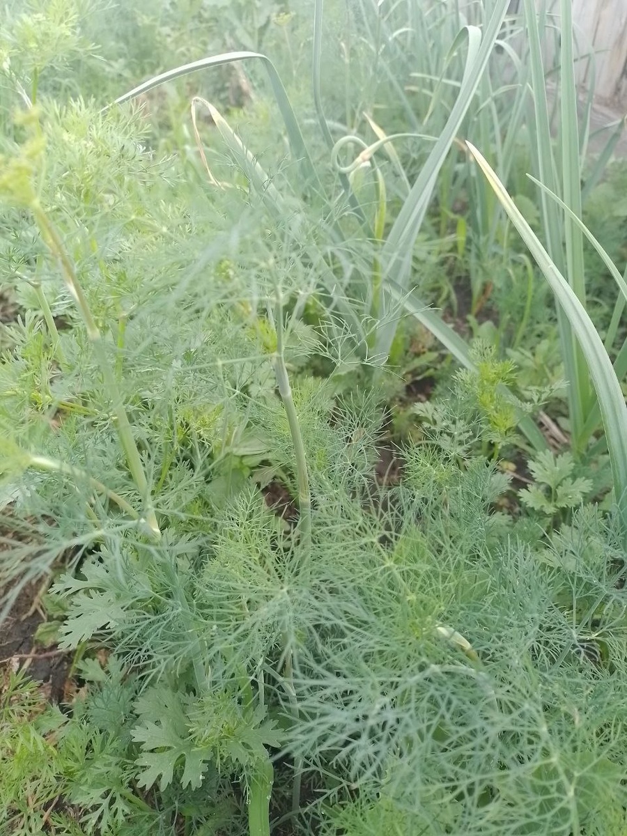 Помимо овощей и цветов у нас растёт конечно же и зелень. Укроп сеется сам и растёт где хочет, не нужный приходиться выдирать, так как растёт сплошняком и давит нужные мне растения. Конечно же я замораживаю его на зиму, потом добавляю в супы и в разные горячие блюда. Кинза, как и укроп растёт у меня самосевом, просто не в таких масштабах. Кинзу употребляем в свежем виде, добавляю в салаты, в горячие блюда, а можем и просто вприкуску к мясу подать. Сейчас кинза уже начинает цвести, надо сказать цветочки у неё очень даже миленькие, хоть в букеты ставь. На зиму собираю семена кинзы, молотые семена (кориандр) добавляю в мясные блюда и в салаты. Салаты сею каждый год, их мы едим в свежем виде. Луки на участке растут разные, из многолетних: батун, слизун, дикий лук и шнитт-лук. Также выращиваем лук на зелень и на репку. Сейчас многолетние луки уже начали цвести и у них стало жёсткое перо. Лук-слизун даже когда цветёт выпускает молодое перо, которое можно использовать. Зимний чеснок выпу