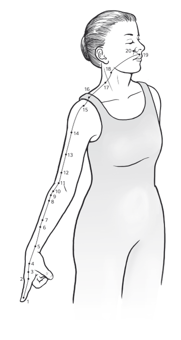 Меридиан толстого кишечника является важным каналом в системе восточной медицины, ответственным за поддержание баланса энергии и здоровья организма. Он простирается от основания среднего пальца кисти вверх по руке, далее переходит на шею и поднимается к лицу, заканчиваясь у края крыла носа. Начинается меридиан в точке LI1 (Шанг-Янг), расположенной на указательном пальце руки, и последовательно проходит через все последующие точки, заканчивая точку LI20 (Ин-Сян).