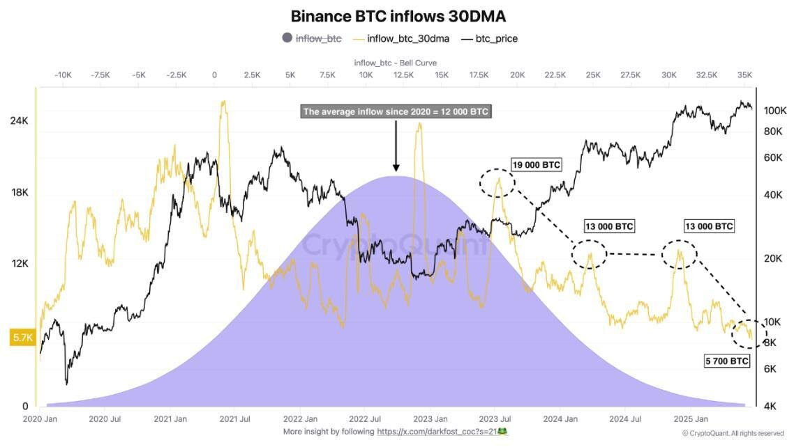 🚨 UPDATE: Bitcoin inflows to Binance have plummeted to only 5,700 $BTC, marking the lowest since the last bear market