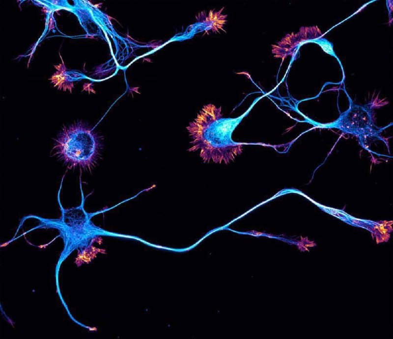 Голубые нейроны гиппокампа На снимке нейроны гиппокампа крысы, окрашенные по микротрубочкам и белку актину Столь высокое качество изображения стало возможным благодаря использованию микроскопии структурированного освещения