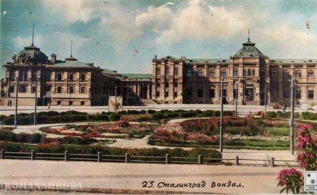 Жителям Волгограда на цветном снимке показали железнодорожный вокзал и прилегающую к нему площадь. В таком виде здание и территория существовали до Великой Отечественной войны. Как сообщает РИАЦ со ссылкой на Царицын.рф, постройку для пассажиров транспортного узла возвели в 1870-х годах, а после несколько раз улучшали. Так, в конце XIX века добавили левое крыло, из-за которого вокзал принял Г-образную форму. А спустя ещё примерно три десятка лет появилось и правое крыло. Тогда сделали и второй этаж над основной частью здания. Таким железнодорожный вокзал Сталинграда и запечатлел фотограф. В объектив его камеры попала и территория, раскинувшаяся перед зданием. Здесь видны посаженные по кругу кусты, которые вместе с мощёными дорожками обрамляют основную клумбу в центре. В сентябре 1942 года в разгар Сталинградской битвы вокзал получил значительные повреждения. После окончания войны его решили не восстанавливать. Руины разобрали, а на их месте в 1954 году построили новое здание по проекту