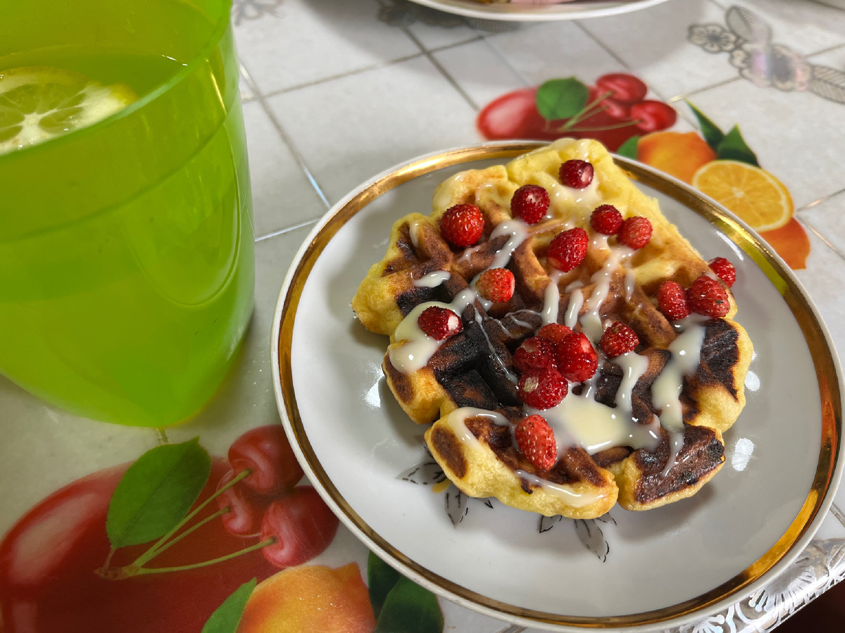 Выходные-время для дачи. Поэтому пролетели выходные бесконечно быстро. Как хорошо быть иногда ребенком, завтрак на даче приготовила нам мама. Это были творожные вафли в вафельнице со сгущенкой и земляникой из посадки. Чай мятный с лимоном. Потом решили закрыть несколько баночек клубничного «Махито». Клубника покраснела за несколько дней, пока нас не было. Из-за постоянных дождей много сгнило, жаль, но погоду нам не поменять. Капуста сформировала уже свои кочаны, поэтому сварили щи с курочкой. Какой нежный и приятный вкус у капусты. Арбуз взяли, вкусный сладкий, но из-за того, что было холодно и пасмурно, даже и арбуз не пошел) Всякая погода хороша, но как же хочется уже тепла и солнышка. Позже приготовила окрошку, люблю ее на квасе, добавив немного майонеза или сметаны. На ужин приготовили крылышки с кабачком на мангале. Свежие овощи со своей грядки. Наконец-то овощи пошли свои, что не может не радовать. Полное ведро кабачков назрело за 4 дня😃 Теперь можно их есть на завтрак обед