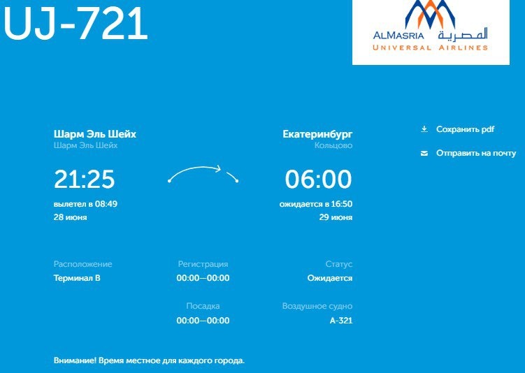 Рейс UJ 721 авиакомпании AlMasria из Шарм-эль-Шейха был назначен на 22:25 вчерашнего дня. Лайнер отправился двумя часами позже, в 00:30, но через 30 мин развернулся и приземлился в Шарме. Причина - техническая.