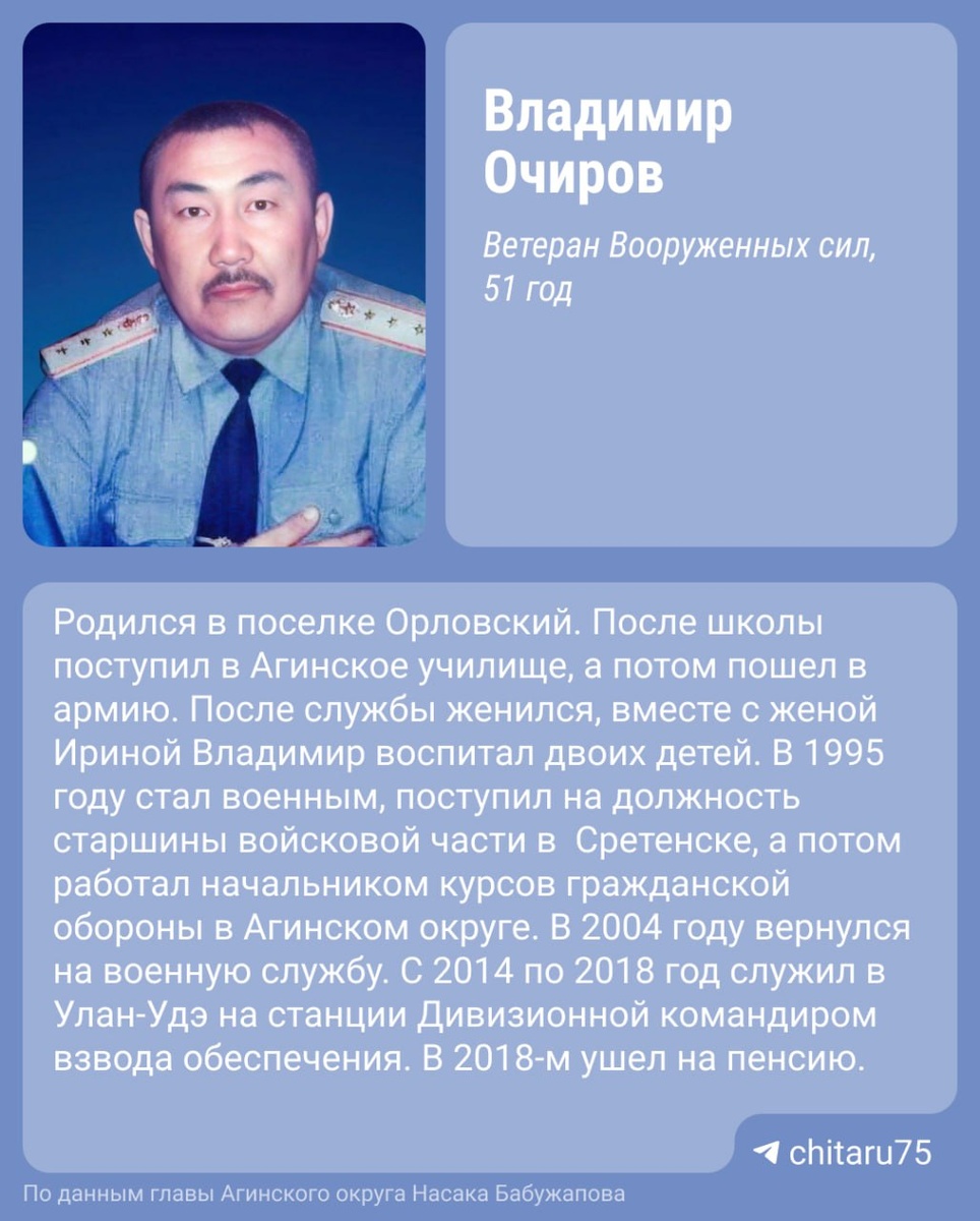 Пошел добровольцем на СВО после смерти сына. Владимир Очиров, ветеран Вооруженных сил из Забайкалья, отправился на спецоперацию после гибели сына Сергея. 26-летний парень погиб в 2022 году, эвакуируя раненых сослуживцев, и был посмертно награжден орденом Мужества. Супруга военнослужащего рассказала, что он был хорошим мужем, любящим отцом, заботливым братом: Не остался в стороне, не смог пережить гибель сына, поэтому отправился добровольцем. Глава Агинского округа Насак Бабужапов объяснил, что за время службы в Забайкалье за добросовестное исполнение обязанностей Владимира неоднократно поощряли ведомственными наградами: медалями «За воинскую доблесть» 1, 2, 3 степени, медалью «За отличие в военной службе», грамотами. За многолетнюю службу его также наградили медалью «Ветеран Вооруженных сил министерства обороны РФ». Владимир погиб 2 апреля 2025 года в населенном пункте Разлив на Южно-Донецком направлении при выполнении воинского долга. Похоронят мужчину в поселке Агинское. 🟦 Под