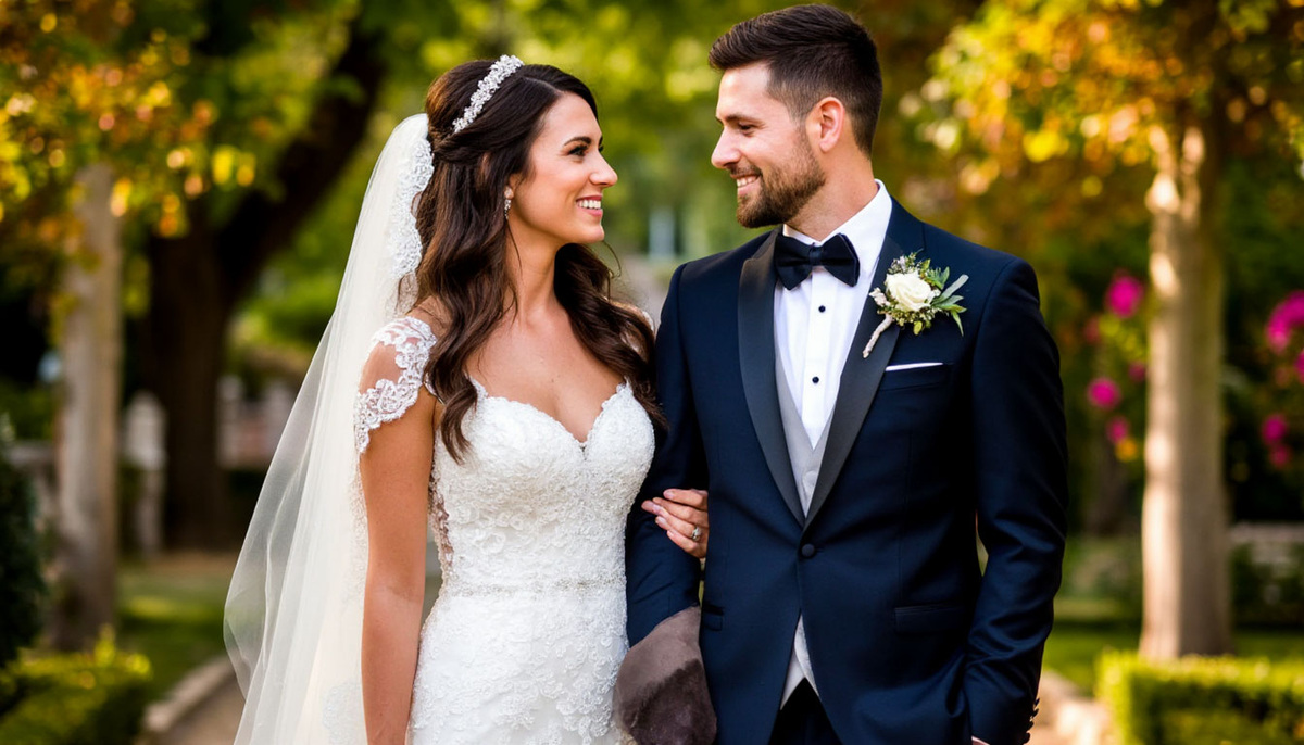 Аня — в белом. Он — рядом. Руки крепко держат её талию.