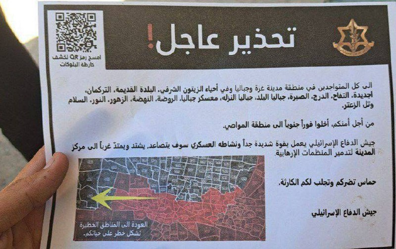 Армия обороны Израиля разбросала листовки в Джабалии и городе Газа в нескольких районах, призывая жителей эвакуироваться на юг в район Аль-Муаси. «Армия обороны Израиля ведет интенсивные действия в этом районе. Ее военная активность будет расширяться на запад, чтобы уничтожить инфраструктуру террористических организаций. ХАМАС пользуется вами и навлекает на вас беду. Возвращение в опасные районы ставит под угрозу ваши жизни».