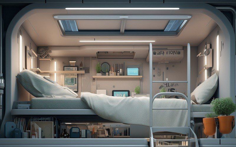 ❗Это модульная система-стенка, в которой совмещены места для сна, рекреации («угол» с освещением и ширмами с шумоизоляцией) и шкафы для хранения вещей.