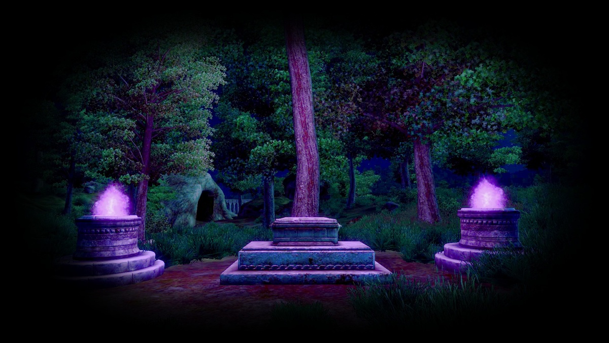 Среди деревьев стоял каменный саркофаг, с обоих сторон которого в жаровнях пылал магический огонь. Чья-то гробница? Час от часу не легче, вдруг сейчас оттуда вылезет что-нибудь жуткое…